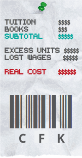 The Cost & Earnings Tool estimates the cost to degree and provides earnings prediction for students depending on income level, age at entry, time to degree and other inputs. The cost includes all kinds of expenses necessary to attend CFK, such as tuition, fees, textbooks, living cost, and others.